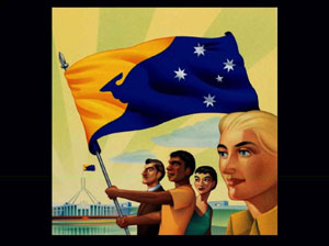 これが現在のオーストラリアの国旗です。ここで支配的な影響というのは、言うまでも無くユニオンジャックです。実は国旗ではなく植民地時代からの旗だったのです。祖始国である英国の国旗があって、この地域のシンボルとして星が描かれています。実際今のオーストラリアは、どちらかというと英国よりも米国に影響を受けていますので、グラフィック化するなら米国の国旗を掲げた方がいいのかもしれません。しかし、私たちとしては独自のアイデンティティを創出し、今までのブランドから脱却して、新しい国旗をブランドとして再構築したいと考えています。