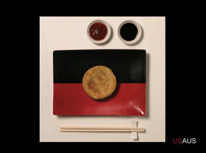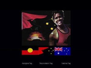 そしてオーストラリアは、私がデザインしたものでありますが、願わくはこういう国旗になればいいと思っています。その国を支えるアイデンティティを考えれば、私どもは英連邦の国でありますが、それぞれの国において国旗があるべきです。植民地時代から引き継いでいますので、なぜ変える必要があるのか、と思う人がいるかもしれません。ハロルド・トマスというデザイナーがいったことですが、現在のオーストラリア国旗は結構カッコイイのですが、先住民としては気分がよくない。というのは英国の国旗は侵略を意味します。しかしユニオンジャックの部分をなくすとユニークさが足りない。そもそも南十字星はオーストラリア以外でも見られるので、古典的なシンボルであるカンガルーを使ったらどうかと考え、シンプルにデザイン化しました。カンガルーが飛躍するイメージを表現しています。先住民に調査をしたところ色が気に入らないという意見がありました。それならば先住民の国旗と同じ色にしたところ、結構さまになったと思います。先住民の方々は好きだといったわけですが、オーストラリア全体を考えるとちょっと先住民色が強すぎるということで、再度色の変更をしました。こちらは多くの人に受け入れられているようです。