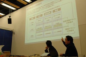 次に平井さんよりINAXのサステナブルデザインの取り組みをご紹介いただきました。INAXのサステナブルに対する取り組みの特徴は、ビジョンという形で2020年をターゲットにバックキャスティングをして、モノをデザインするのではなく、「行為」から新たなデザインを提示していることです。モノではなく行為から探って新たな価値を提案するためには、行為が変わるべきであり、そのためにはモノをデザインするのではなく、行為をデザインする。バックキャスティングの中で、企業のビジョンとコアコンピタンスを探り、新たな価値を提案しています。