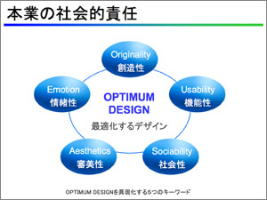 コクヨさんは本業の社会的責任として「OPTIMUM DESIGN(最適化するデザイン)」というキーワードで無駄を消費させないという概念があります。そのキーワードとして、「Originality(創造性)」「Usability(機能性)」「Sociability(社会性)」「Aesthetics(審美生)」「Emotion(情緒性)」という5つを挙げています。