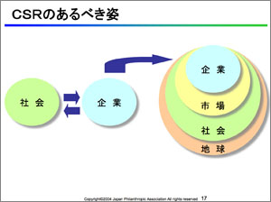 CSRのあるべき姿として、企業が社会に何ができるか、社会が地球に対してどうあるべきかを考えがちですが、そうではなくて地球において社会はどうあるべきか、社会において企業はどうあるべきかという風に考えなくてはなりません。