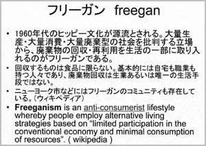 フリーガンですが、ウィキペディアに定義が載っていて、ピッピー文化の流れをくんでいるとか、大量生産大量消費大量廃棄を批判するとかホームレスでないと言っていましたが、さっき映像に出てきた彼女は高校の教師で、アイロンをまねていた彼は一流の金融マンで年収2000万円を超えていたけれども仕事を辞めたとか、そういう人が沢山います。この人たちが何を考えているのだろうというところで話が進んでいます。