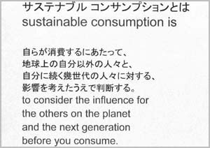 サステナブル・コンサンプション、日本ではまだあまり馴染みのない言葉ですがこれも定義があります。ひとつだけではなく様々な定義がありますが、一番古いのが1994年のノルウェーの環境省から出ています。これ以降90年代から現在まで10数年間使い続けられていますが、フェアトレードに代表されるもののように、日本だけのものじゃなく海外との関係、他の地域との関係を重要視するという概念が非常に色濃く入ってきています。従って今新たに定義する、これは昨年のアメリカのISID,ISAの会議で盛んに言われていたことですが、掻い摘んで言うと自ら消費するにあたり、地球上の自分以外の人間、今地球には65億5千万人いますから64億4999万999人のことを考えるということです。もうひとつはその自分に続く世代、発表者は「ネクストジェネレーション」と10回繰り返していましたが、10世代先への影響を考えて消費することを決めるということです。これ考えると何も買えないですね。わからないことだらけですから。ですが、そのくらい考えて消費をしようというのがサステナブル・コンサンプションの基本的なスタンスです。それは新しい消費にしてもそうですが、再生することも入るだろうとトム・ジョンソンさんが付け足してくれました。
