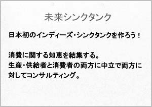最後に黒崎さんがみんなで未来シンクタンクを作ろうとおっしゃいました。日本初のインディーズのシンクタンクを作り、そこに商品開発する知恵を結集してオープンリソースで全ての人に中立的な立場でコンサルティングしていこうということです。