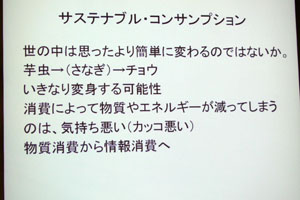 高い車を買うより自転車のほうがお洒落だとか、あるいはもっと打算的にお得だとか、新しいビジネスが見つかりそうだとか、そういうところから次々に変わってきています。世の中は思っているより簡単に変わるのではないか、イモムシが蝶になる時にプロセスがみえないように、実は世の中は今サナギの状態なのかもしれないというお話もありました。減るのがわかっていることが気持ち悪い、かっこ悪いとか、物質的な消費よりも情報に関心が移っているのではないかということでした。